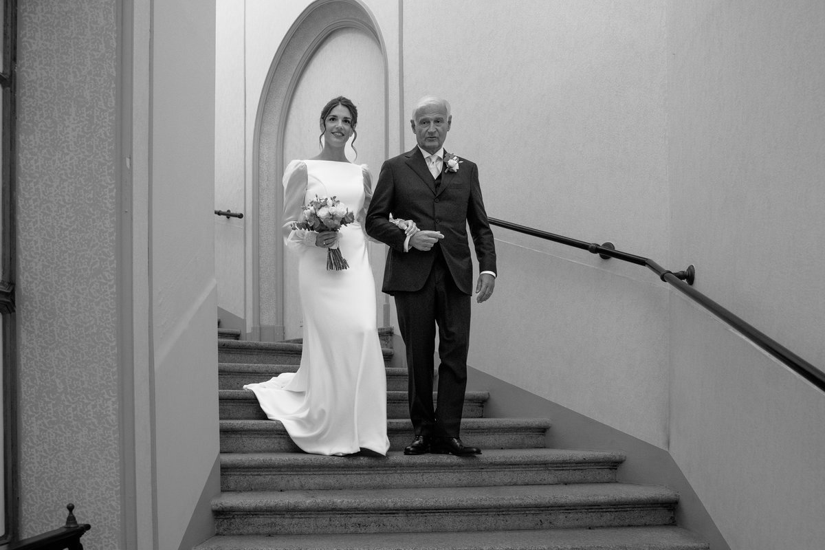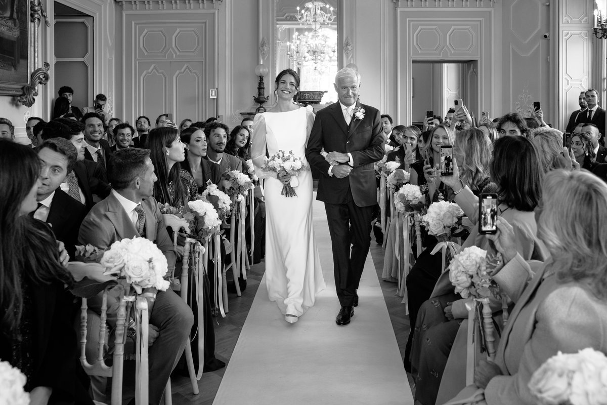 In questo momento adoro catturare le espressioni, gli sguardi e i piccoli gesti che rendono ogni matrimonio unico. La disposizione degli invitati, la luce che accompagna il percorso degli sposi e l’architettura della sala permettono di creare immagini eleganti e coerenti con uno stile editoriale.