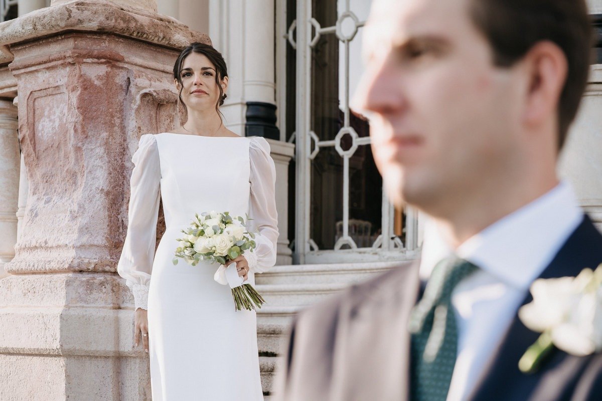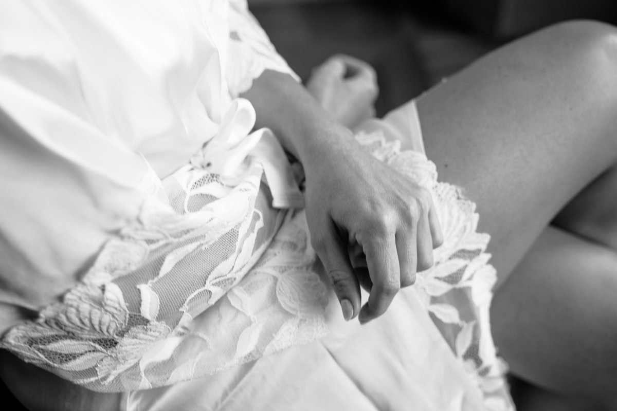 I dettagli hanno un ruolo centrale. Il tessuto della vestaglia, le mani che si appoggiano sulle ginocchia, un orecchino sistemato con attenzione, sono elementi semplici, ma fondamentali per raccontare un matrimonio così elegante con uno stile coerente e pulito.