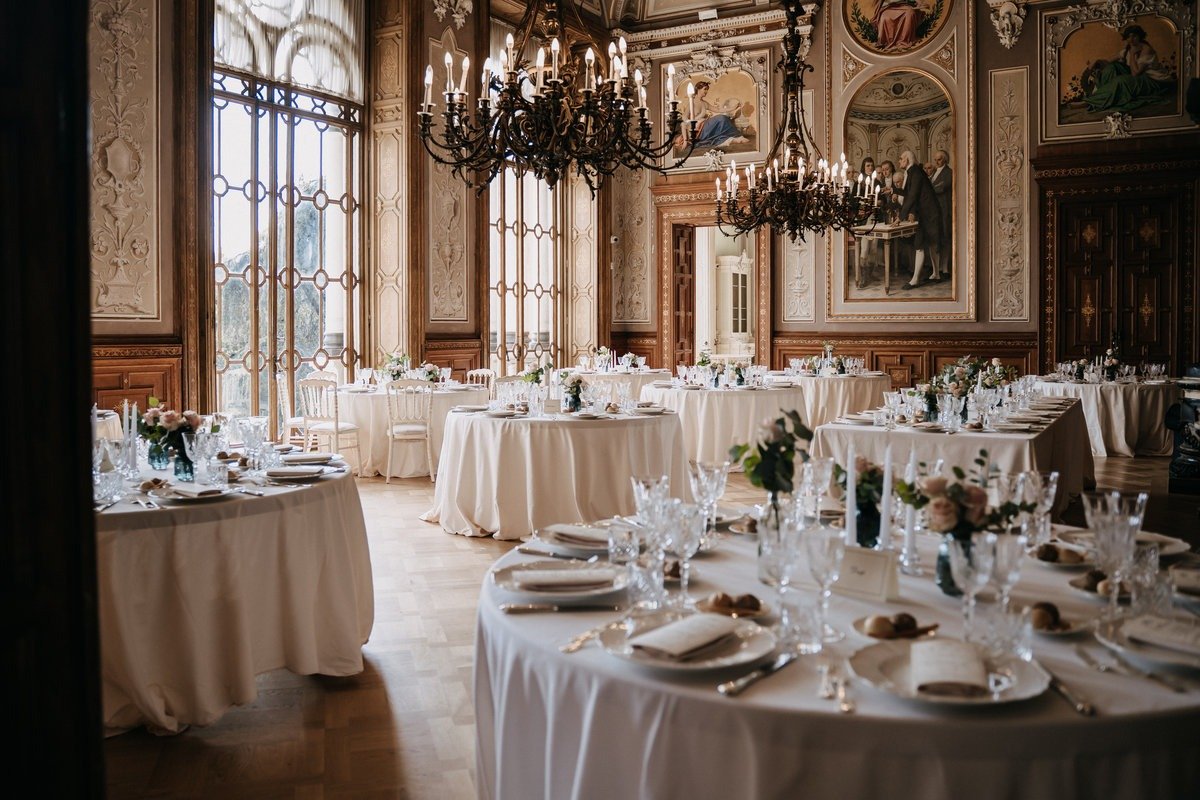 Le sale storiche, i lampadari, le pareti decorate e la luce naturale filtrata dalle grandi finestre hanno creato un contesto perfetto per un matrimonio di questo genere.