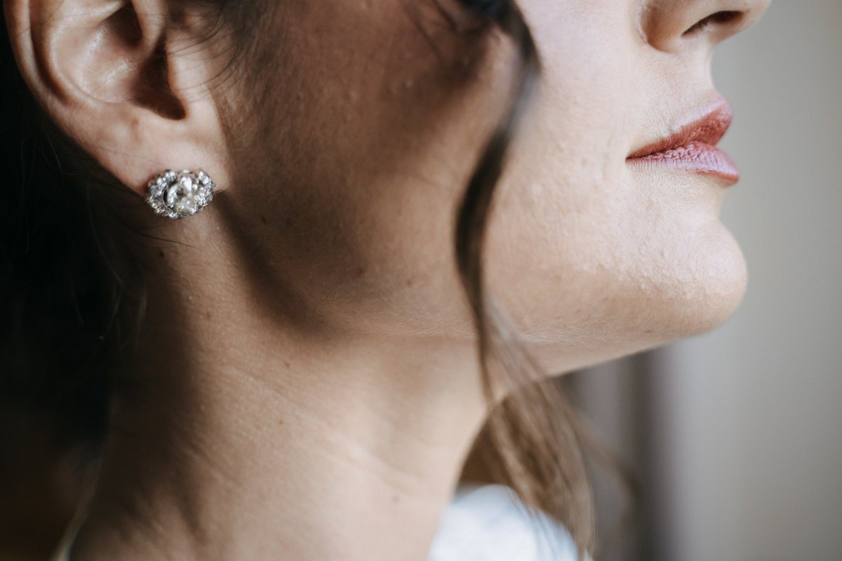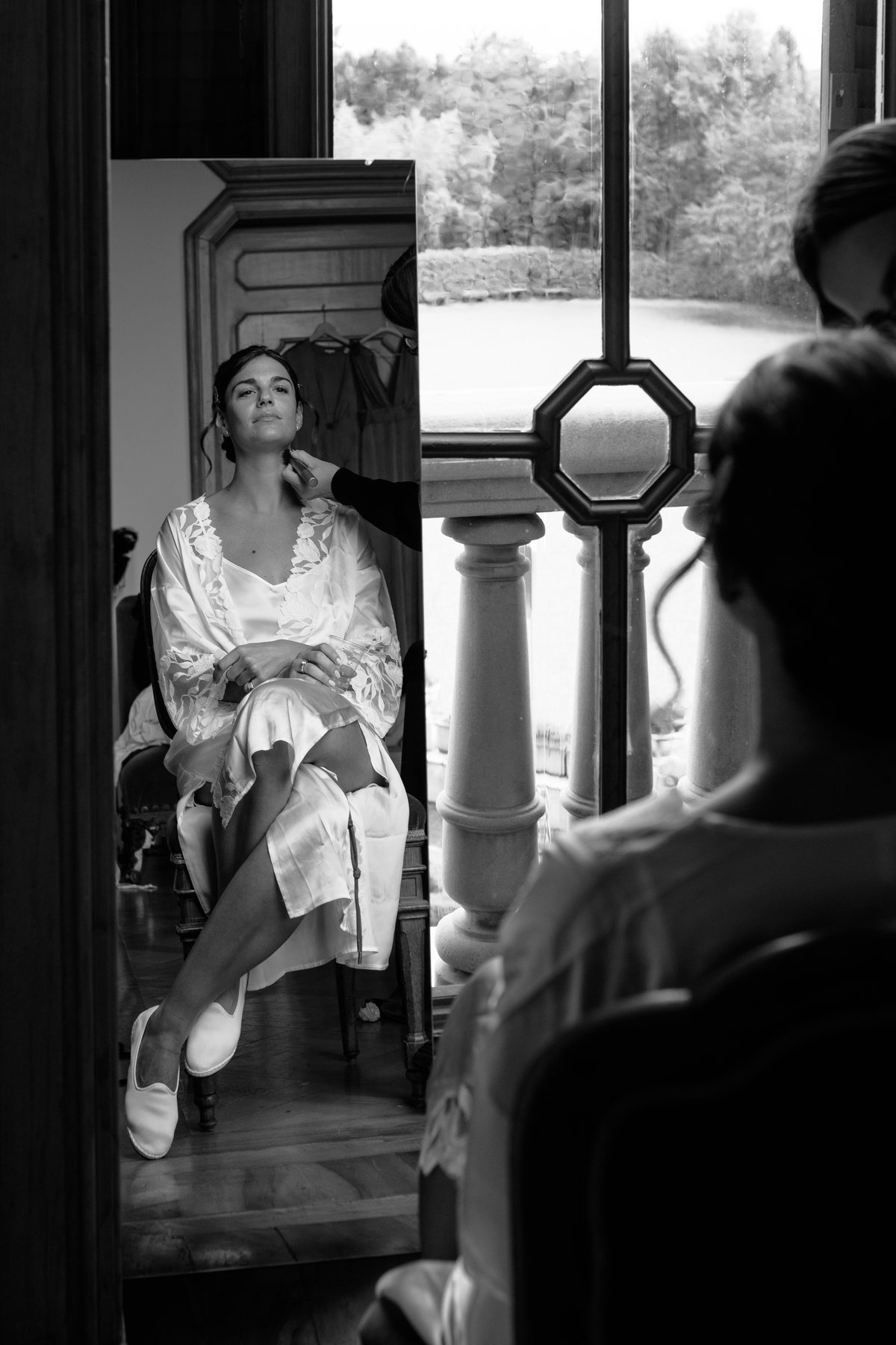 I dettagli hanno un ruolo centrale. Il tessuto della vestaglia, le mani che si appoggiano sulle ginocchia, un orecchino sistemato con attenzione, sono elementi semplici, ma fondamentali per raccontare un matrimonio così elegante con uno stile coerente e pulito.