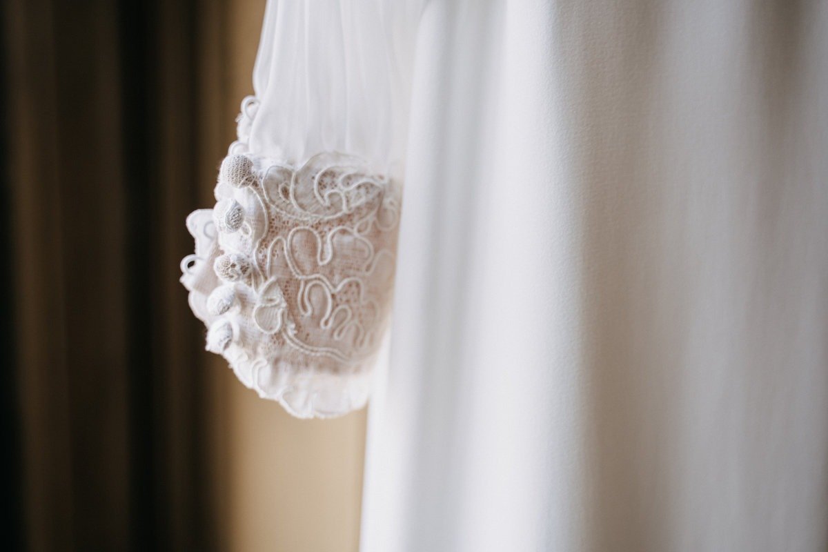 L’abito appeso vicino alla finestra diventa parte del racconto. La sposa lo osserva, lo sfiora, prende confidenza con ciò che indosserà di lì a poco. La luce laterale mette in risalto i materiali, i ricami e le linee dell’abito, valorizzando ogni dettaglio.